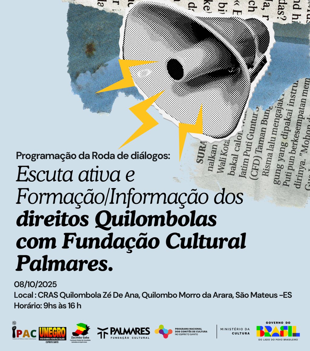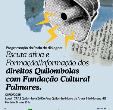 São Mateus, ES — Hoje, a partir das 9h, terá início no CRAS Quilombola Zé de Ana, no Quilombo Morro da Arara, a Roda de Diálogos: Escuta Ativa e Formação/Informação dos Direitos Quilombolas, organizada pela Fundação Cultural Palmares. O encontro segue até às 16h e reúne lideranças quilombolas, representantes de órgãos públicos e sociedade civil para dialogar sobre os direitos territoriais, culturais, sociais e econômicos das comunidades quilombolas.